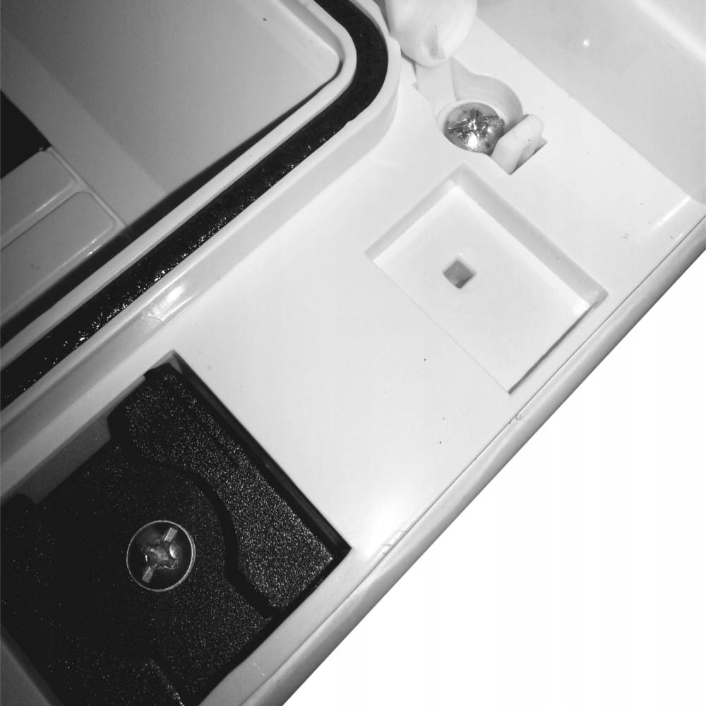 Obudowa wykonana z tworzywa sztucznego w kolorze białym (RAL 9003) jest odporna na codzienne użytkowanie i łatwa w utrzymaniu. Kompaktowe wymiary pozwalają na montaż w miejscach o ograniczonej przestrzeni, bez utraty funkcjonalności.