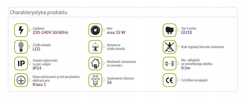 Wewnątrz lampy znajduje się 1 gniazdo GU10 co zapewnia mocny strumień światła, doskonale nadający się do oświetlenia elewacji czy tarasu.