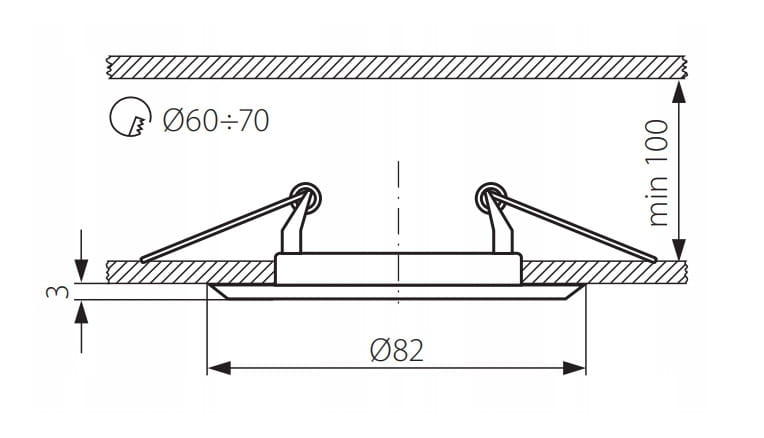 Otwór montażowy 60-70mm. Szerokość całkowita oprawy to 82mm. Oprawa zawiera przyłącze Mr16 z przewodem.