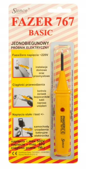 Jednobiegunowy wielofunkcyjny próbnik elektryczny FAZER 767 BASIC przeznaczony jest do wykonywania podstawowych testów instalacji elektrycznych 220V/380V, instalacji samochodowych i innych instalacji elektrycznych. Precyzyjna, dopracowana konstrukcja układu procesora Fazera pozwala na zapewnienie bardzo małego zużycia energii. Alkaliczne baterie LR44 zapewniają przeprowadzenie ponad 10000 wskazań. Pozwala miedzy innymi wykrywać 0/1 oraz pozwala sprawdzić, czy rezystor, kondensator, dioda i tranzystor nie są uszkodzone.