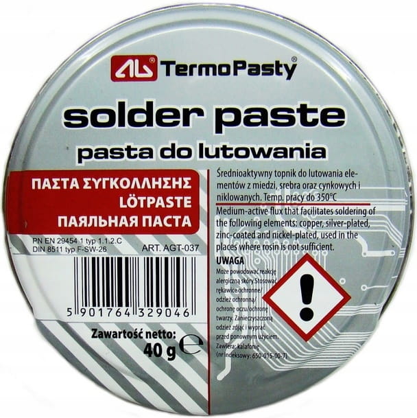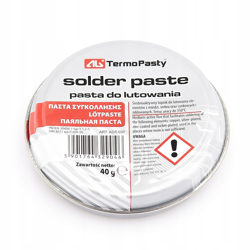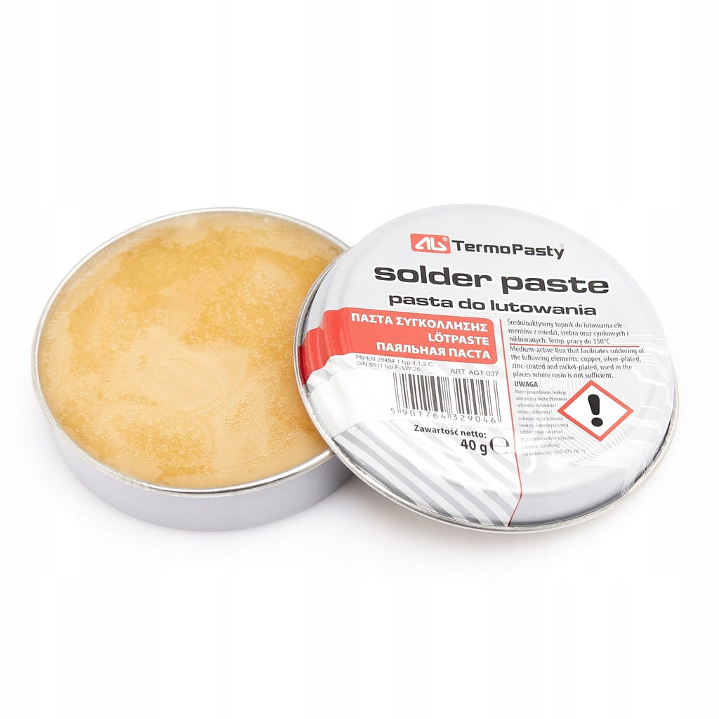 Pasta lutownicza firmy AG Termopasty jest stworzona na bazie kalafonii i zawiera średnioaktywny topnik. Produkt ułatwia lutowanie komponentów posiadających elementy wykonane z miedzi, srebra, cynku i niklu. W technice radiowej, komunikacyjnej oraz przy montażu urządzeń elektronicznych stosuje się ją do pobielania i lutowania. Nie należy obawiać się, że pozostałości będą wywoływać korozję na metalach nieżelaznych. Zbędne resztki powinno się przemywać zmywaczem alkoholowym, ponieważ pasta lutownicza nie rozpuszcza się w wodzie.