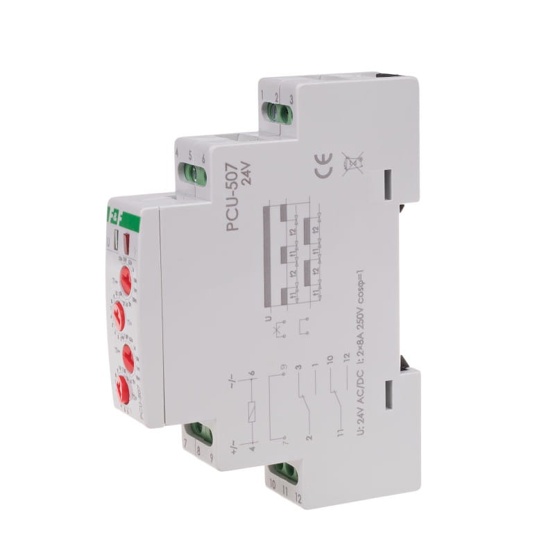 Do czasu załączenia przekaźnika styki pozostają w pozycji 2-3 i 11-10. Po podaniu napięcia zasilającego styki zostają przełączony w pozycję 2-1 i 11-12 na czas t1. Po odmierzeniu czasu t1 styki powracają do pozycji 2-3 i 11-10 na czas t2. Sekwencja tych przełączeń realizowana jest cyklicznie.