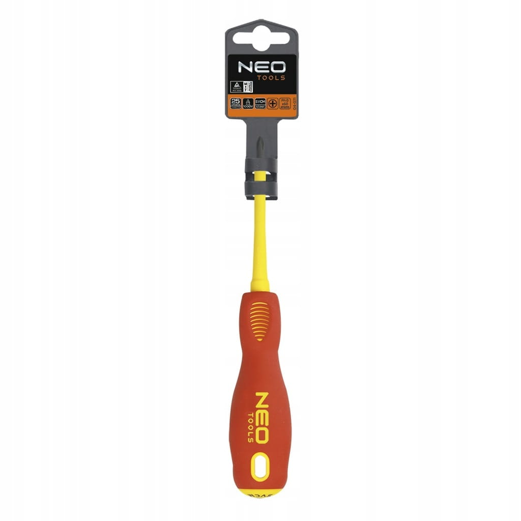 Wkrętak krzyżowy 1000V NEO (nr ref. 04-071) o wymiarach PH0 x 60 mm. Atestowany do pracy pod napięciem do 1000 V. Grot wkrętaka wykonany jest z wyjątkowo wytrzymałej stali SVCM. Końcówka robocza grota została poddana obróbce cieplnej, dzięki czemu uzyskano odpowiednią twardość i odporność na zgięcia 56 HRC. Wkrętak posiada magnetyczną końcówkę. Trójgraniasty kształt uchwytu z wyprofilowanym oparciem dla kciuka zmniejsza obciążenie dłoni podczas pracy i ułatwia uzyskanie optymalnego momentu obrotowego. Dwumateriałowy uchwyt zapobiega ślizganiu się w dłoni, odporny jest na działanie chemikaliów, olejów i smarów. Jakość narzędzia potwierdzona certyfikatem TÜV i 25-letnią gw. producenta. Marka NEO spełnia oczekiwania profesjonalistów.