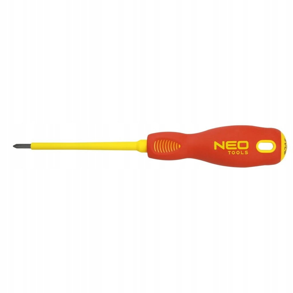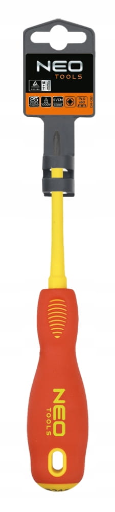 Wkrętak krzyżowy 1000V NEO (nr ref. 04-062) o wymiarach PZ1 x 80 mm. Atestowany do pracy pod napięciem do 1000 V. Grot wkrętaka wykonany jest z wyjątkowo wytrzymałej stali SVCM. Końcówka robocza grota została poddana obróbce cieplnej, dzięki czemu uzyskano odpowiednią twardość i odporność na zgięcia 56 HRC. Wkrętak posiada magnetyczną końcówkę. Trójgraniasty kształt uchwytu z wyprofilowanym oparciem dla kciuka zmniejsza obciążenie dłoni podczas pracy i ułatwia uzyskanie optymalnego momentu obrotowego. Dwumateriałowy uchwyt zapobiega ślizganiu się w dłoni, odporny jest na działanie chemikaliów, olejów i smarów. Marka NEO spełnia oczekiwania profesjonalistów.