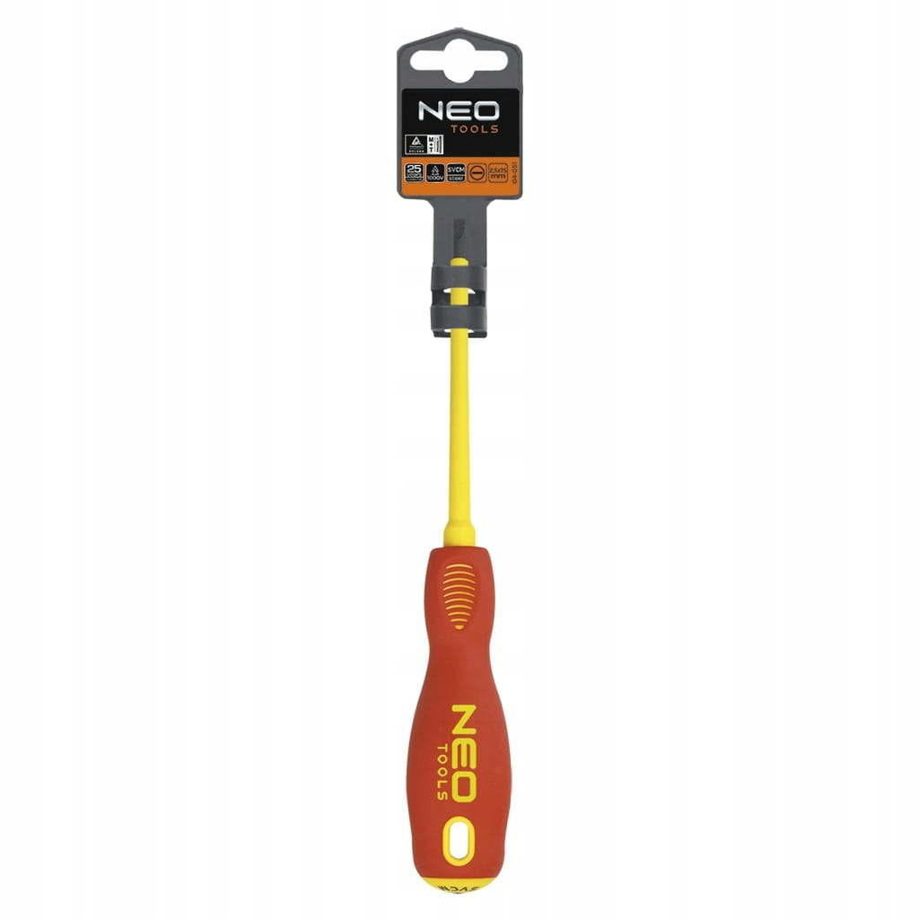 Wkrętak płaski 1000V NEO (nr ref. 04-051) o wymiarach 2.5 x 75 mm. Atestowany do pracy pod napięciem do 1000 V. Grot wkrętaka wykonany jest z wyjątkowo wytrzymałej stali SVCM. Końcówka robocza grota została poddana obróbce cieplnej, dzięki czemu uzyskano odpowiednią twardość i odporność na zgięcia 56 HRC. Wkrętak posiada magnetyczną końcówkę. Trójgraniasty kształt uchwytu z wyprofilowanym oparciem dla kciuka zmniejsza obciążenie dłoni podczas pracy i ułatwia uzyskanie optymalnego momentu obrotowego. Dwumateriałowy uchwyt zapobiega ślizganiu się w dłoni, odporny jest na działanie chemikaliów, olejów i smarów. Marka NEO spełnia oczekiwania profesjonalistów.