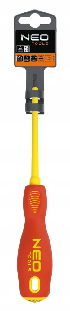 Atestowany do pracy pod napięciem do 1000 V. Grot wkrętaka wykonany jest z wyjątkowo wytrzymałej stali SVCM. Końcówka robocza grota została poddana obróbce cieplnej, dzięki czemu uzyskano odpowiednią twardość i odporność na zgięcia 56 HRC. Wkrętak posiada magnetyczną końcówkę. Trójgraniasty kształt uchwytu z wyprofilowanym oparciem dla kciuka zmniejsza obciążenie dłoni podczas pracy i ułatwia uzyskanie optymalnego momentu obrotowego. Dwumateriałowy uchwyt zapobiega ślizganiu się w dłoni, odporny jest na działanie chemikaliów, olejów i smarów. Marka NEO spełnia oczekiwania profesjonalistów.
