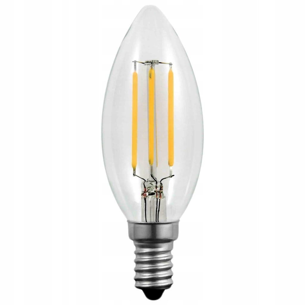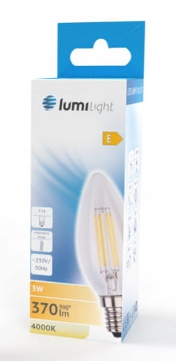 Żarówka LED z trzonkiem E14 odpowiednik żarówki tradycyjnej o takim samym trzonku. C35 oznacza kształt świecy. Diody LED w kształcie włókien – filamentów. Zasilana napięciem 230V przemiennym. Dostępna o mocy 3W w barwie neutralnej.