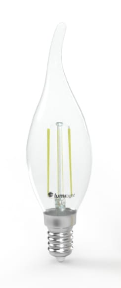 Estetyczna żarówka C-35 z filamentowymi włóknami w szklanej bańce z charakterystycznym kształtem przypominającym płomień świecy. Żarówki te cechują się wysoką wydajnością oraz ciekawym designem.