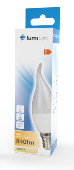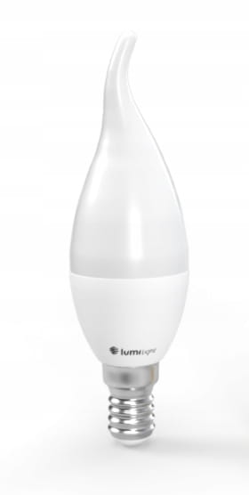 Żarówka LED z trzonkiem E14 odpowiednik żarówki tradycyjnej o takim samym trzonku. C37 oznacza kształt świecy. Zasilana napięciem 230V przemiennym. Dostępna o mocy 8W w barwie neutralnej.