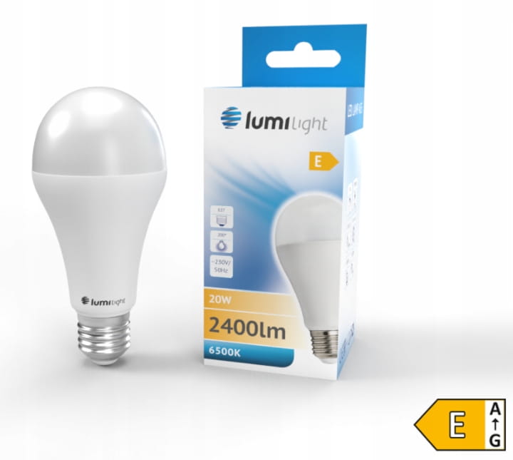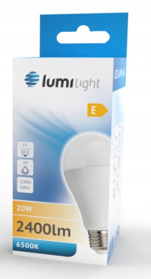 Żarówka LED z trzonkiem E27 odpowiednik żarówki tradycyjnej o takim samym trzonku. A65 oznacza kształt żarówki tradycyjnej. Zasilana napięciem 230V przemiennym. Dostępna o mocy 20W w barwie ciepłej, neutralnej i zimnej.