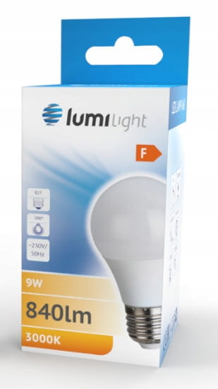 Żarówka LED z trzonkiem E27 odpowiednik żarówki tradycyjnej o takim samym trzonku. A60 oznacza kształt żarówki tradycyjnej. Zasilana napięciem 230V przemiennym. Dostępna o mocy 9W w barwie ciepłej, neutralnej oraz zimnej.