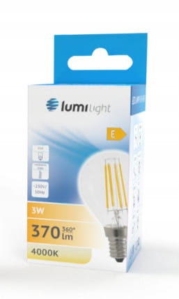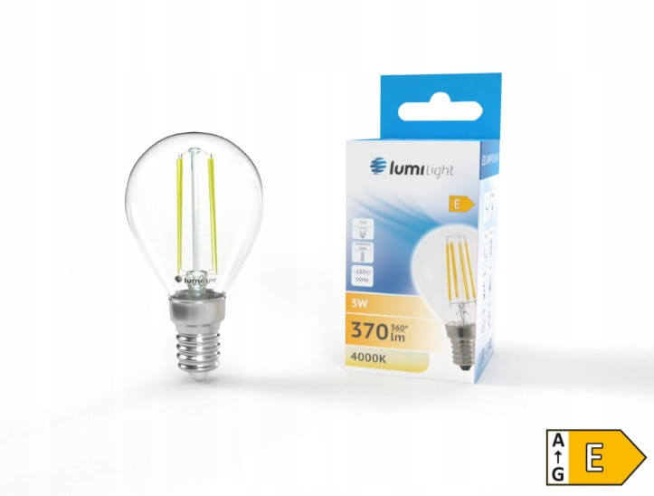Żarówka LED z trzonkiem E14 odpowiednik żarówki tradycyjnej o takim samym trzonku. G45 oznacza kształt kulki. Diody LED w kształcie włókien – filamentów. Zasilana napięciem 230V przemiennym. Dostępna o mocy 3W w barwie neutralnej.