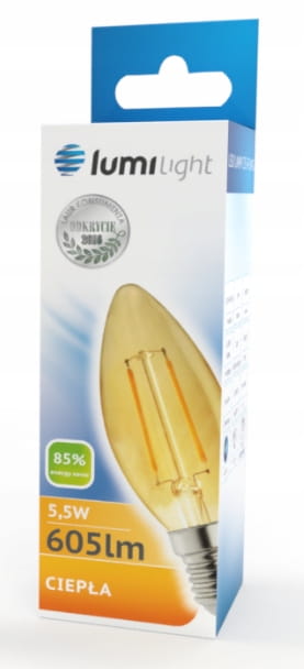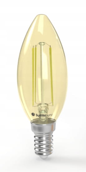 Żarówka LED z trzonkiem E14 odpowiednik żarówki tradycyjnej o takim samym trzonku. C35 oznacza kształt świecy. Diody LED w kształcie włókien – filamentów. Zasilana napięciem 230V przemiennym. Dostępna o mocy 5,5W w barwie ciepłej.