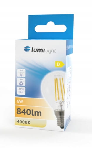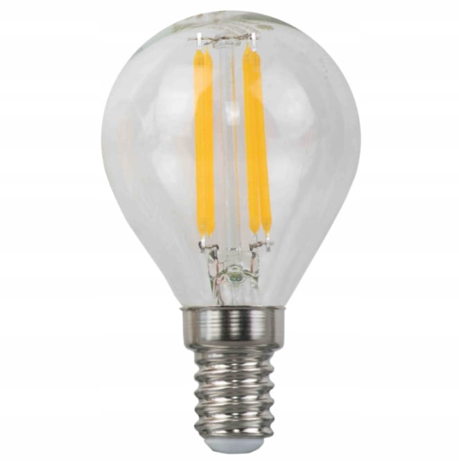 Żarówka LED z trzonkiem E14 odpowiednik żarówki tradycyjnej o takim samym trzonku. G45 oznacza kształt kulki. Diody LED w kształcie włókien – filamentów. Zasilana napięciem 230V przemiennym. Dostępna o mocy 6W w barwie neutralnej.