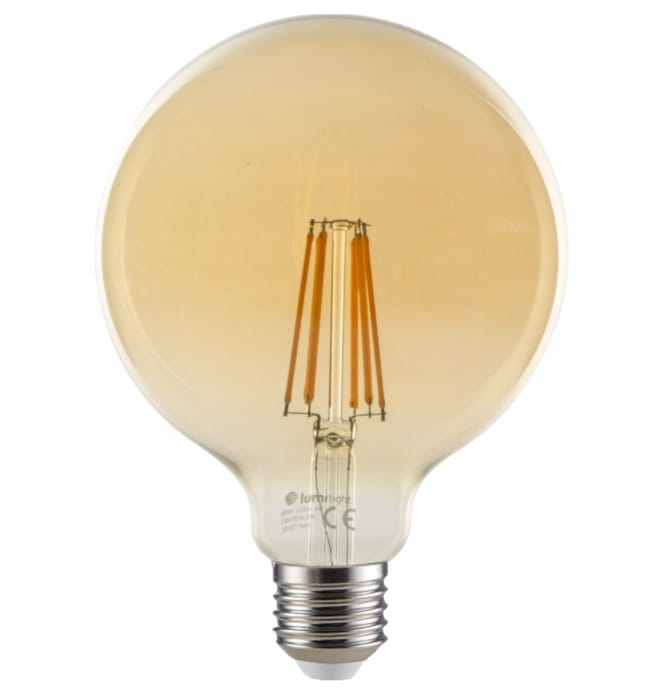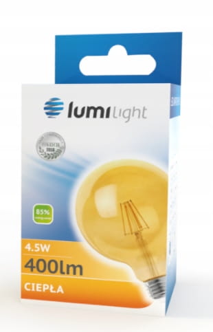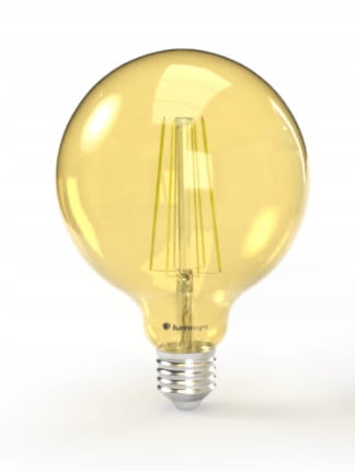 Ozdobna żarówka LED G80-FLMG z trzonkiem E27. Diody LED w kształcie włókien – filamentów. Zasilana napięciem 230V przemiennym. O mocy 4,5W w barwie ciepłej.
