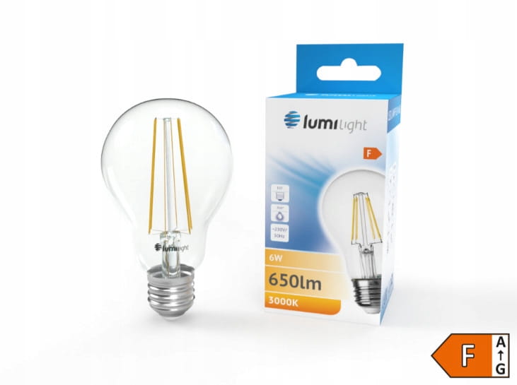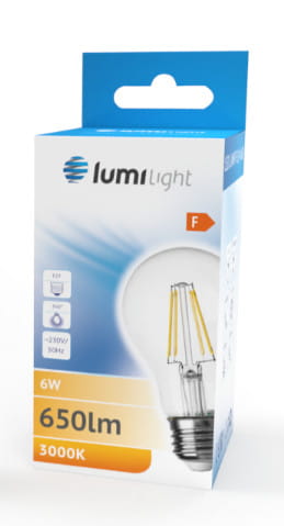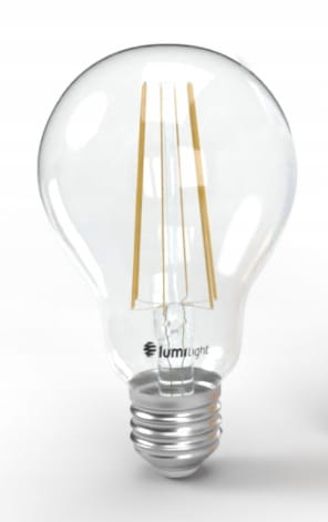 Żarówka LED z trzonkiem E27 odpowiednik żarówki tradycyjnej o takim samym trzonku. A60 oznacza kształt żarówki tradycyjnej. Diody LED w kształcie włókien – filamentów. Zasilana napięciem 230V przemiennym. Dostępna o mocy 6W w barwie ciepłej.