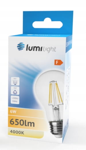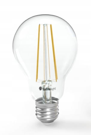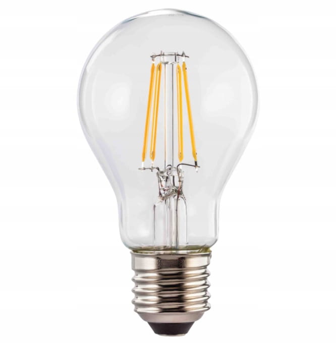 Żarówka LED z trzonkiem E27 odpowiednik żarówki tradycyjnej o takim samym trzonku. A60 oznacza kształt żarówki tradycyjnej. Diody LED w kształcie włókien – filamentów. Zasilana napięciem 230V przemiennym. Dostępna o mocy 6,5W w barwie ciepłej.