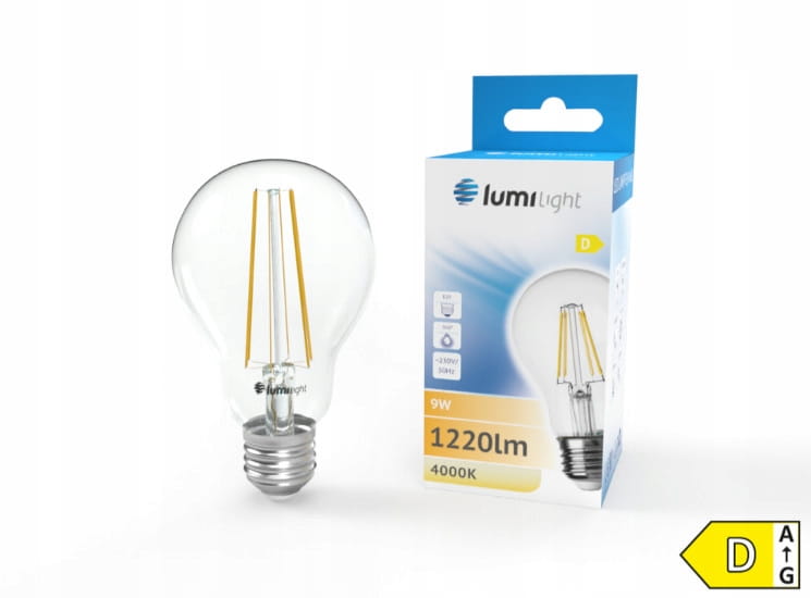 Żarówka LED z trzonkiem E27 odpowiednik żarówki tradycyjnej o takim samym trzonku. A60 oznacza kształt żarówki tradycyjnej. Diody LED w kształcie włókien – filamentów. Zasilana napięciem 230V przemiennym. Dostępna o mocy 9W w barwie ciepłej i neutralnej.