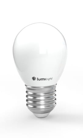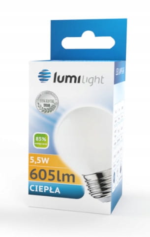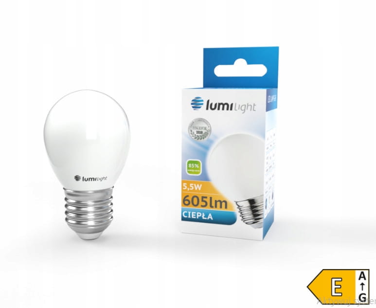 Żarówka LED z trzonkiem E27 odpowiednik żarówki tradycyjnej o takim samym trzonku. G45 oznacza kształt kulki. Zasilana napięciem 230V przemiennym. Dostępna o mocy 5,5W w barwie ciepłej.