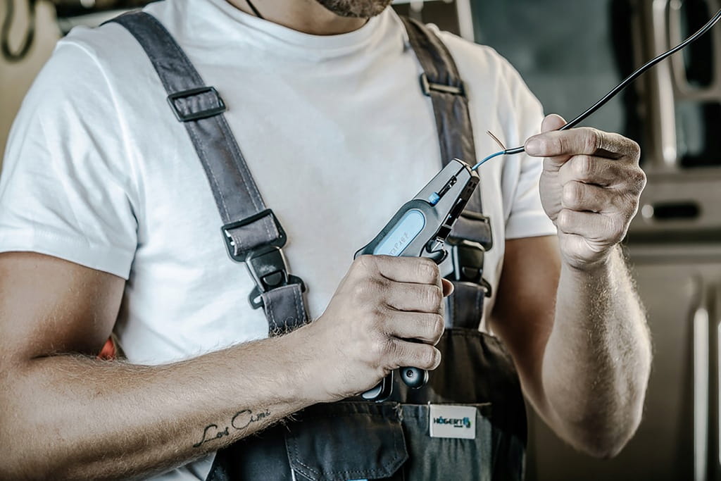 Automatyczny ściągacz izolacji z kabli. Kształt narzędzia umożliwia dostęp do trudno dostępnych miejsc. Wykorzystywane przy pracach instalacyjnych i montażowych.