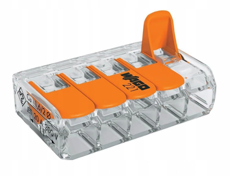 Wszechstronność: Szybkozłączka WAGO 5x4mm 221-415 umożliwia połączenie pięciu przewodów o przekroju 4 mm² każdy. Jest to idealne rozwiązanie do zastosowań, gdzie potrzebujesz łączyć kilka przewodów w jednym punkcie, np. w instalacjach elektrycznych, automatyce przemysłowej czy elektronice.