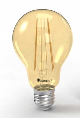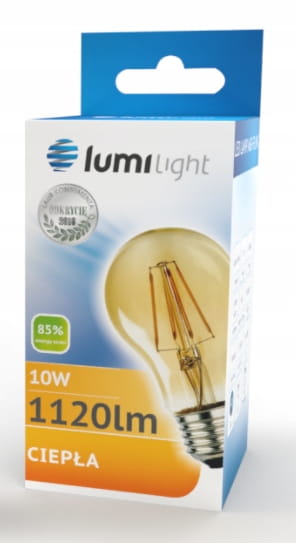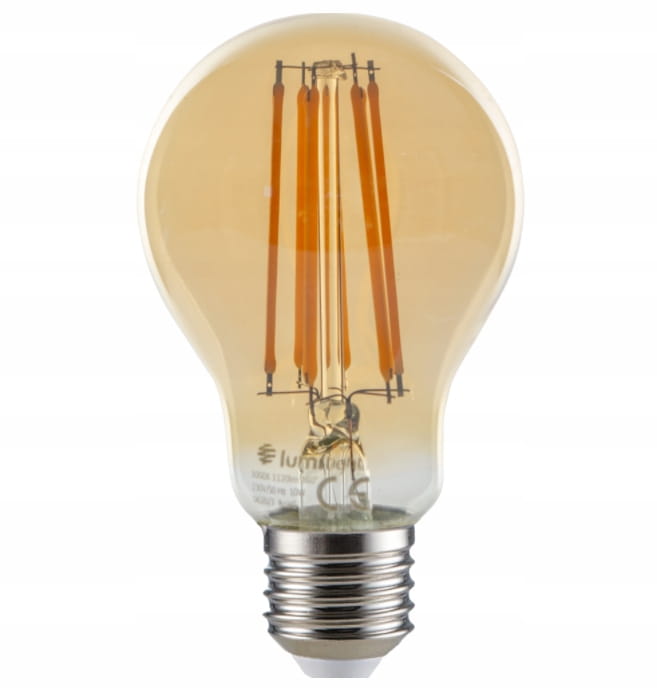 Żarówka LED z trzonkiem E27 odpowiednik żarówki tradycyjnej o takim samym trzonku. A60 oznacza kształt żarówki tradycyjnej. Diody LED w kształcie włókien – filamentów. Zasilana napięciem 230V przemiennym. Dostępna o mocy 10W w barwie ciepłej.