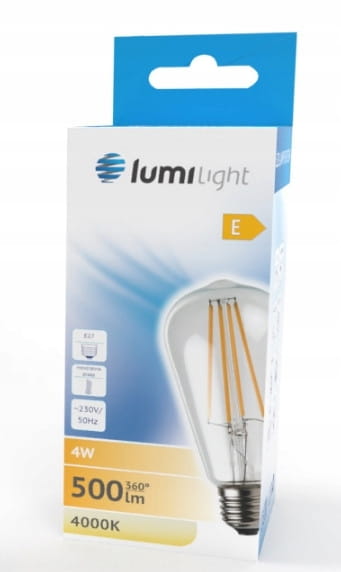 Ozdobna żarówka LED ST64 z trzonkiem E27. Diody LED w kształcie włókien – filamentów. Zasilana napięciem 230V przemiennym. Dostępna o mocy 4W w barwie neutralnej.