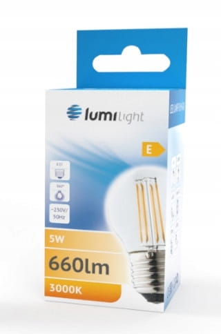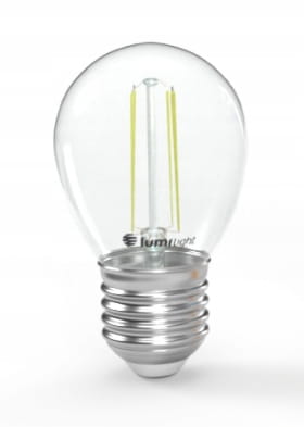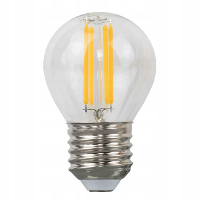 Żarówka LED z trzonkiem E27 odpowiednik żarówki tradycyjnej o takim samym trzonku. G45 oznacza kształt kulki. Diody LED w kształcie włókien – filamentów. Zasilana napięciem 230V przemiennym. Dostępna o mocy 5W w barwie ciepłej.